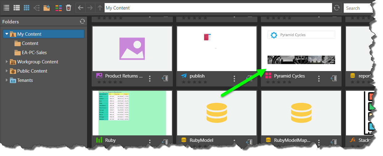 When opening Present content from the content manager, the default action is to open the presentation in 'runtime' - which effectively opens the dashboard content in "show mode" for immediate viewing and consumption, rather than editing. The "view" function can be modulated to either open the presentation directly on the first slide or let the user see all the slides first and allow them to pick their own starting point using the 'Presentation Launcher'.