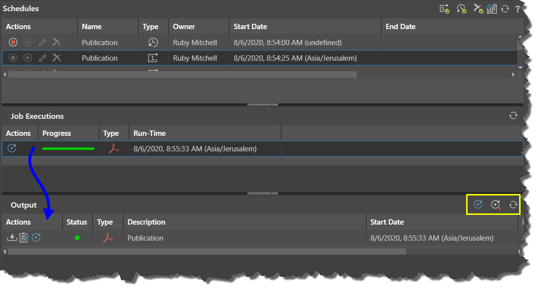 You can view the output of a specific job execution by clicking on the job's listing. This will open the Output panel for the selected job execution (blue arrow below). The output panel has slightly different functionality based on the content type.