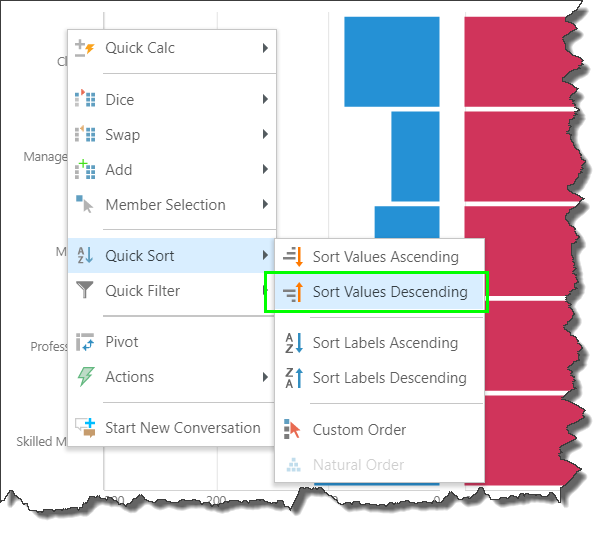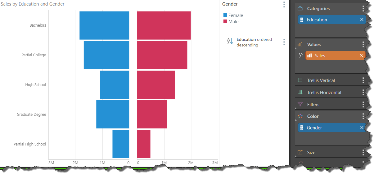 To build a tornado chart, you must place 1 hierarchy, containing 2 member elements, in the Color drop zone. Another larger hierarchy must be added to Categories, and a measure to Values. You can then sort the chart by the hierarchy on the y-axis to display the bars in order of widest to thinnest.