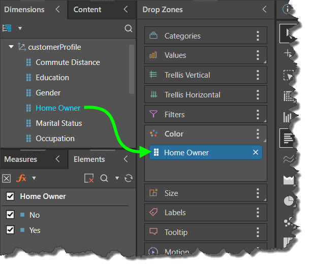 Add a hierarchy containing 2 member elements to the Color drop zone. In this example, based on the Sample Demo model, the Home Owner hierarchy was added to Color.