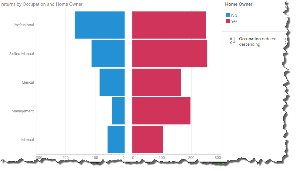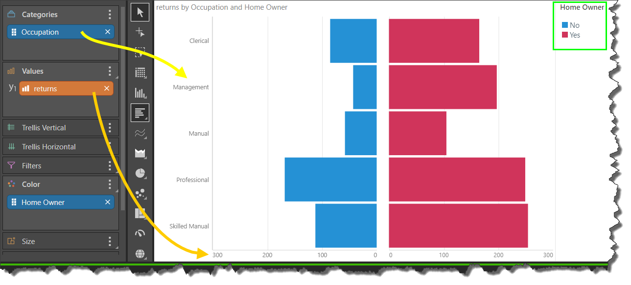 One the measure is added, the visualization is drawn. We see Occupation on the y-axis (yellow arrow below), Returns on the x-axis (orange arrow), and Home Owner driving the color of each chart, with the key displayed in the legend (green highlight).