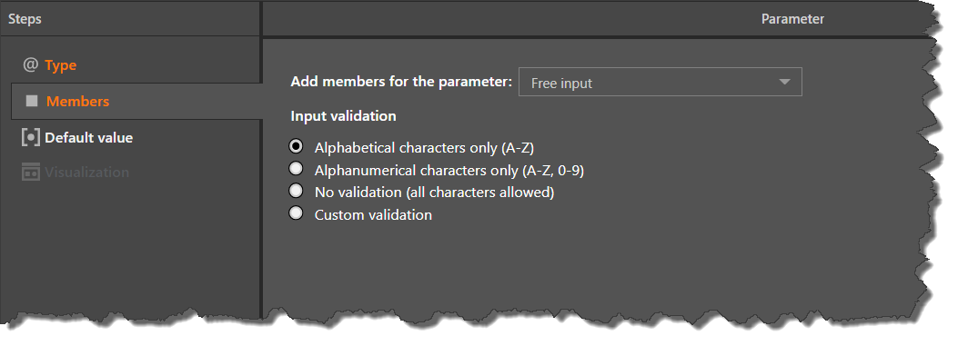 Define the discrete list from the Members panel. Click the blue plus sign to add as many parameter members as necessary. To remove a parameter member, click the x next to it.