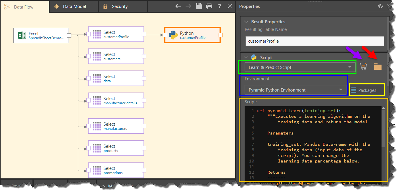 Script Editor: write the Python learn and predict script (orange highlight). If you import a script from the Marketplace or content system, it will be added to the script editor when selected.