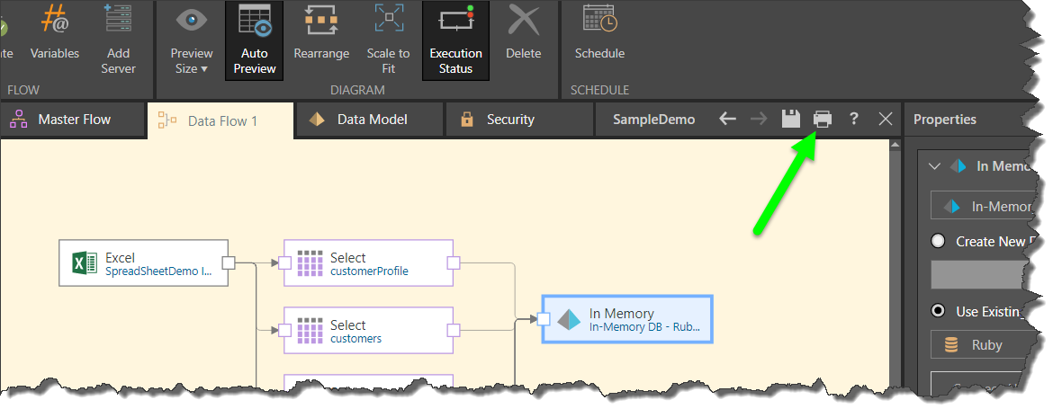 To export a summary of the ETL flow simple click the print icon from any tab in the Model interface; the summary will be downloaded as a PDF, which you can save, print, or share as required.