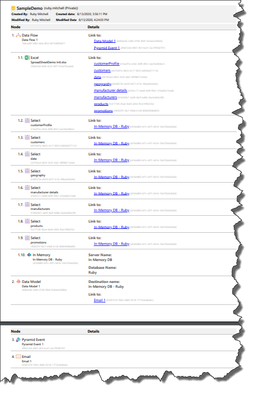 Next, you'll see a list of each node in the ETL, and details corresponding the each note. For instance, you'll see the data source along with the tables imported from it, and each node in the Data Flow. You'll also see the Data Model node, along with its metadata.