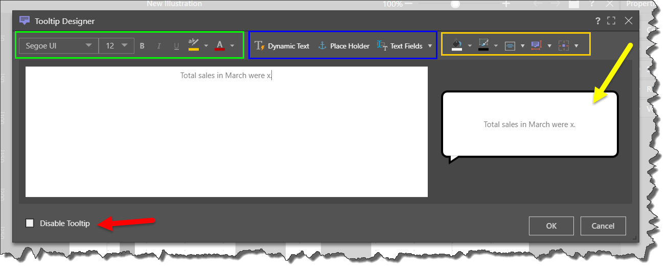 • Enter the tooltip text in the text editor; on the right you'll see a preview of your tooltip, including text and formatting (yellow arrow).