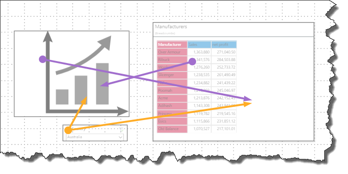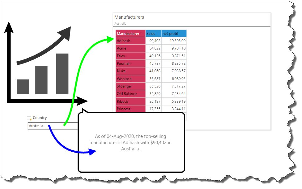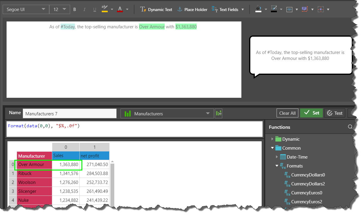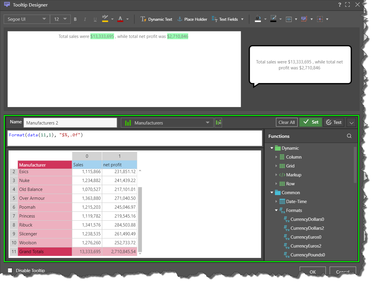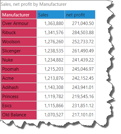 The following example shows the creation of a dynamic tooltip that features dynamic text, a dynamic place holder, and a text field. The example is based on the following grid, showing Sales and Net Profit by Manufacturer, and sorted in descending order.