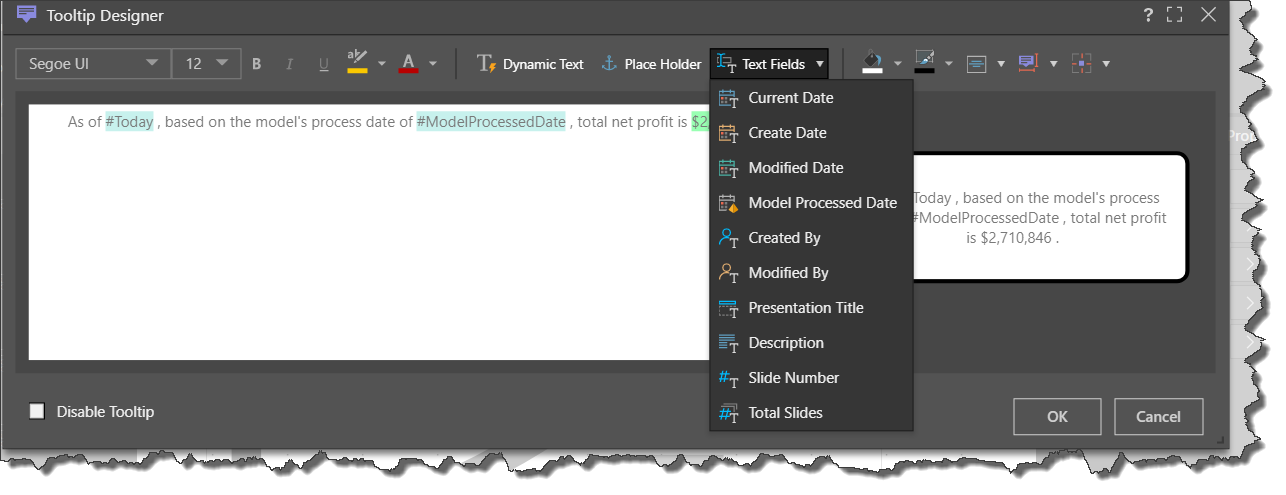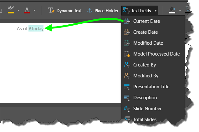 Add dynamic text fields from the drop-down menu. Selecting a text field will add the relevant tag to the tooltip; this is then rendered at runtime to reflect the dynamic value. For example, selecting the ‘Current Date’ text field will add the tag ‘#Today’ to the tooltip. When the presentation is launched in runtime, the tag will be rendered to display today’s date.