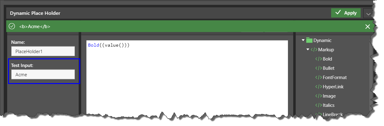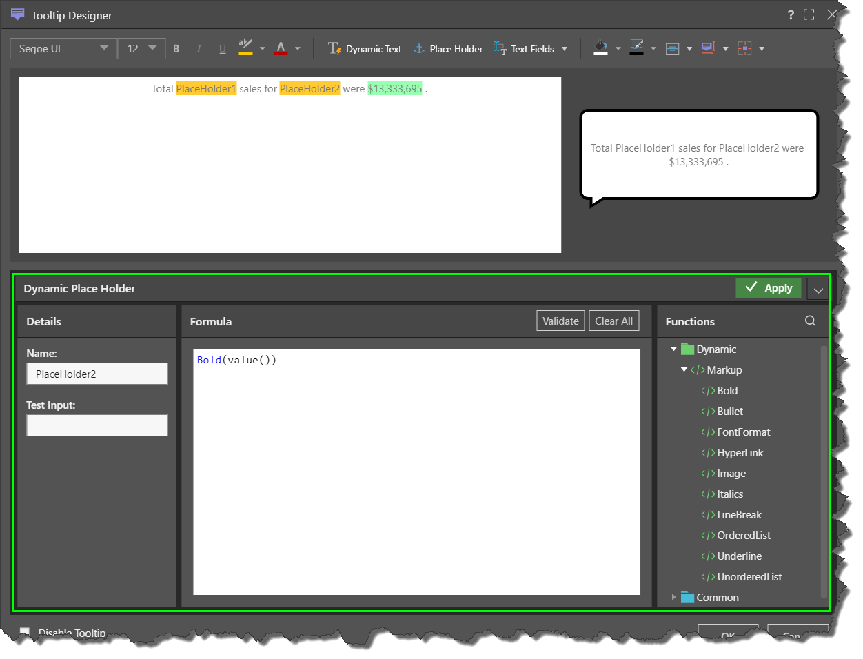 This option will open the Dynamic Place Holder editor where you can create formula using the function trees. Unlike dynamic text, place holders are slicer-driven; instead of creating a formula based on an underlying grid, simply add an interaction from a slicer to the tooltip. The slicer selection will feed the placeholder value at runtime.