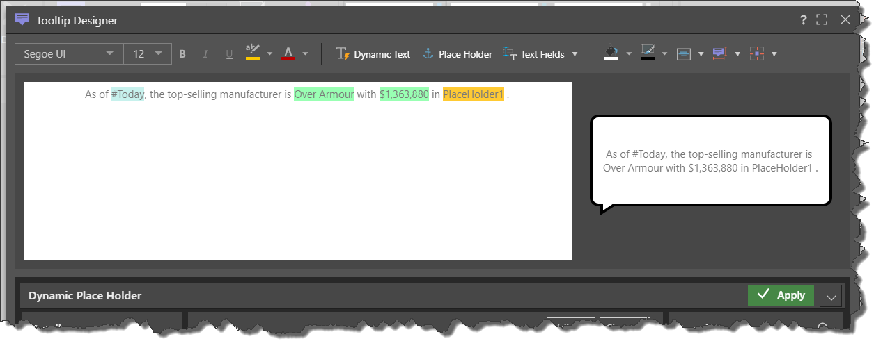 • To make your tooltip dynamic, you can apply dynamic text, dynamic placeholders, and dynamic text fields (blue highlight).