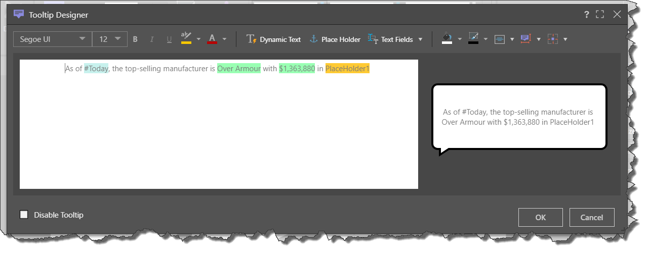 • Use the tooltip designer to create your tooltip. You can set the font type, size, emphasis, color, and highlights (green highlight above).