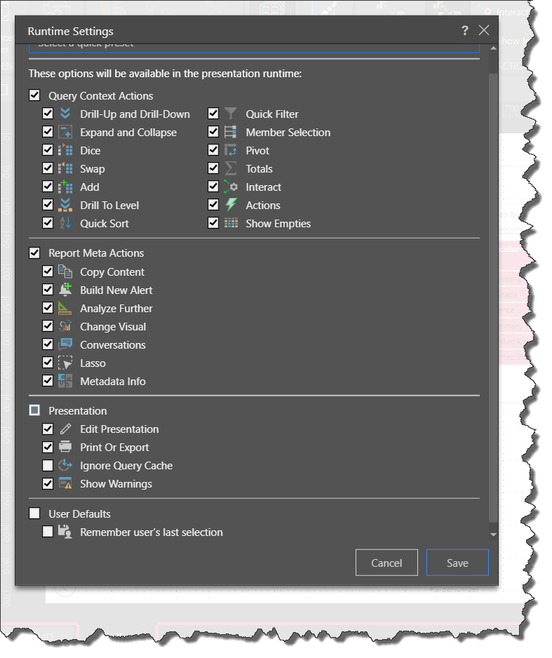 When a user configures runtime settings, those settings are applied to the presentation for all users. However, any other users with write permissions to the presentation have the ability to change the runtime settings.