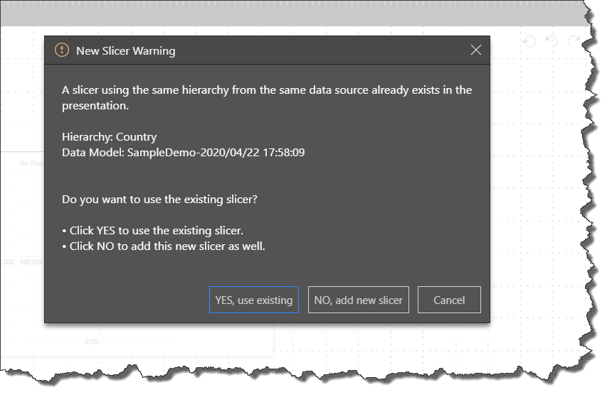 If you copy and paste an existing slicer, or add a slicer from the same data source and hierarchy as an existing slicer in the presentation, you will be presented with the New Slicer Warning dialog: