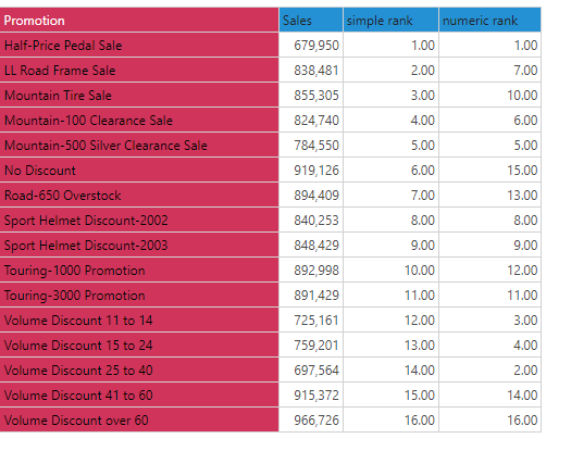 The numeric rank (third measure in the grid below), using but the promotion item's sales value and ranks it in the order of the other promotional element sales. So Half-Price pedal sale is still ranked "1" - since it has the lowest sales in the list, while "No Discount" is ranked 15th, since it is the second highest sales value in the list.