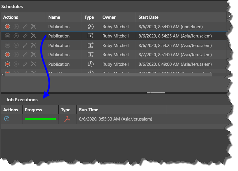 Each time a schedule is run, its creates a "job". To view the historical list of job executions for a particular schedule, click on the schedule item in the list to show all its current and previous job executions. Each listing in the job executions will display the following columns: