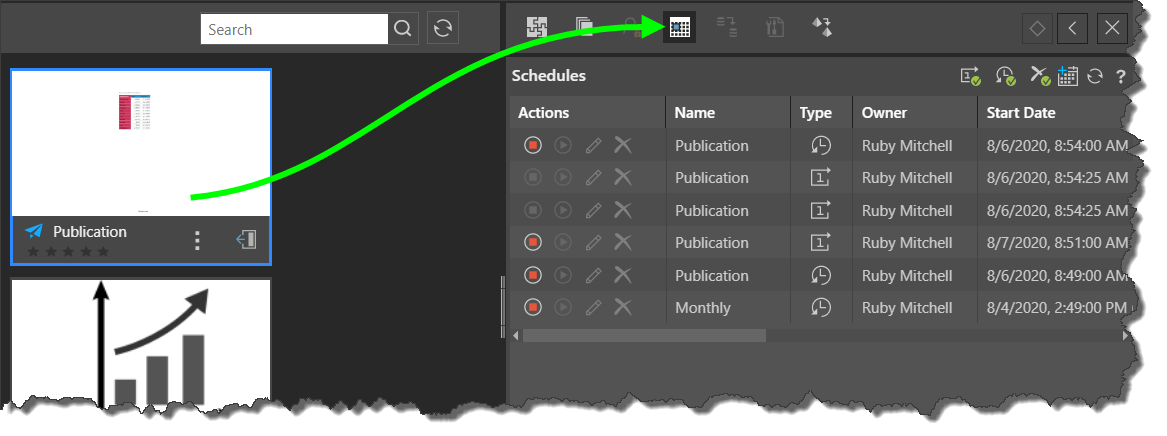 - Type: the icon indicates the schedule type; either a one-off or recurring.