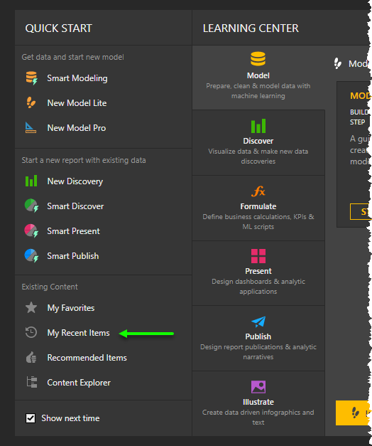 "Recents" is a FLAT listing of all recently used content items by the current user - providing a convenient mechanism for users to quickly find the latest items they used. Recent content can be accessed from the Home Dashboard as well as many other locations through the application where content is accessed.