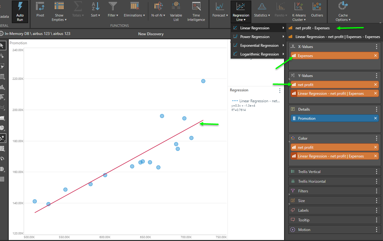 Instead of using the ribbon regression tool, you can also use the context calculation menus to build regressions on one or more measures. Unlike the basic ribbon technique, the context menu option allows for regressions across two or more measures (dependent and independent variables) - offering more sophisticated logic. This is similar to the scatter plot option described above; except it will operate in any visual format.