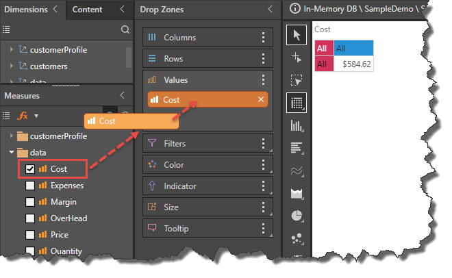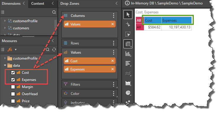 When working with grids, the Values zone works in conjunction with the Columns and Rows zones.