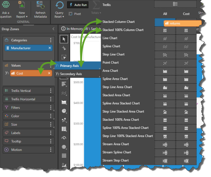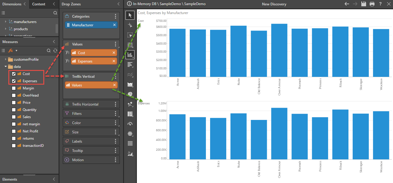 If more than one measure is added to Values, and Values chip will be generated and added to Trellis Vertical, resulting in multiple charts. The Values chip may be moved to Trellis Horizontal or Filters.