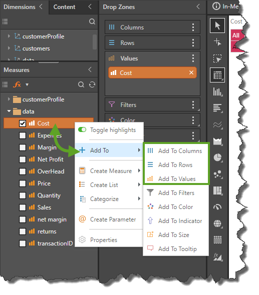 The Values drop zone drives the quantitative data in the query. The Values zone is where values (measures) being added to the query should be placed. The behavior of the Values zone differs according to the visualization type selected.