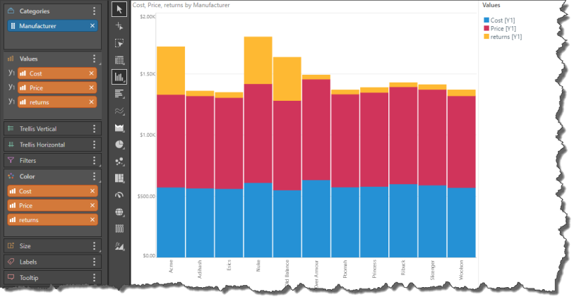 All given measures will be listed in both the Values and Color drop zones, and the resulting chart will display the given measures in a stacked format: