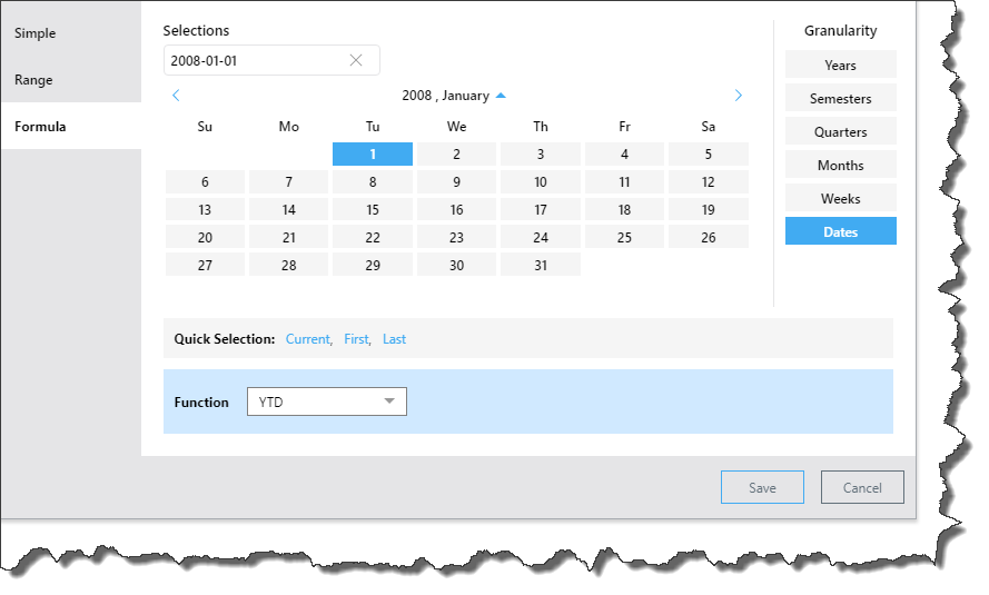 Current: depending on the given level of granularity, selects today's date (if it exists in the system) or the current year, semester, quarter, month, or week. If the current date/ time period doesn't exist in the system, the last date/ time period will be selected instead.