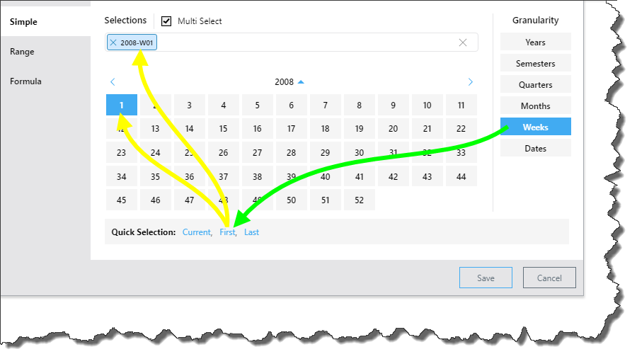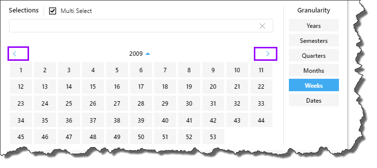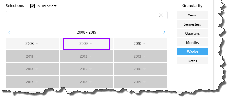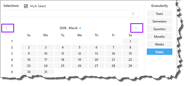 The Simple calendar picker enables the selection of one or more elements. To select more than 1 element, ensure that Multi Select is enabled; you can then select multiple elements from any level of granularity. The query will be filtered by the element(s) that you've selected.