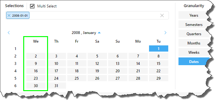 By default, granularity is enabled, meaning you can change the granularity in the calendar picker in order to filter by a variety of date/ time groupings, like year, quarter, or week.
