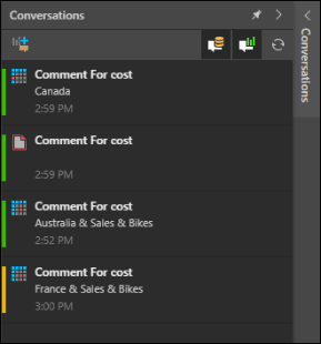 - Open the Conversations Panel (by clicking Conversations in the Home ribbon) and filter by global or report specific conversations. A list of conversations based on any member or cell in the visual will open. Click the relevant conversation to open it.