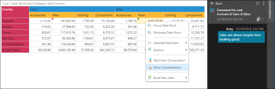 Start by enabling conversations from the Home ribbon. When a conversation is added at the member or cell level, a highlight will appear over the given member or cell in a grid. In a chart, the highlight will appear in the tooltip.