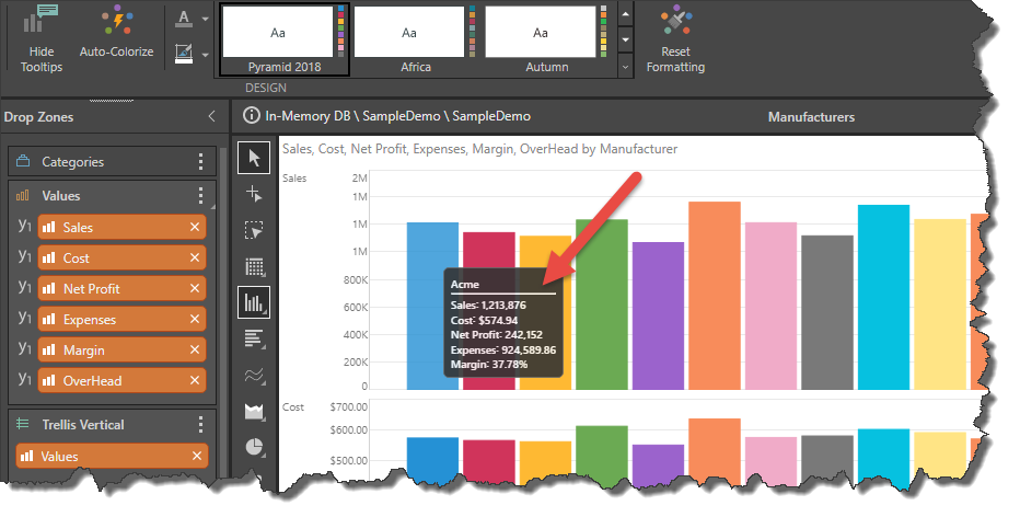 In this example, tooltips are enabled; the tooltip is displayed when hovering over a data point (red arrow).