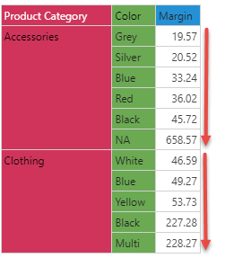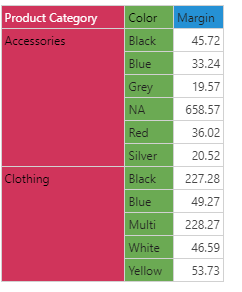 For example, the above grids simply choose margin. The user could decide to sort the items using 'Sales figures for Male customers in 2018' for each category-color combination instead. You can see below that the resulting grid shows the same margin values for category-color combinations, but the order is different to the above.