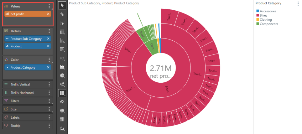 Add the Net Profit measure to the Values zone. You will now have a basic sunburst chart showing profit by each level of the product hierarchy.