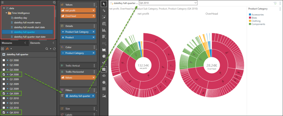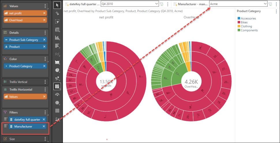 Add the Overhead measure to the Trellis Horizontal zone to compare net profit with overhead across 2 charts.