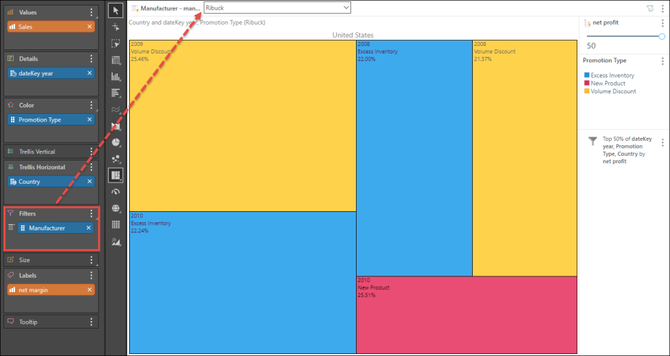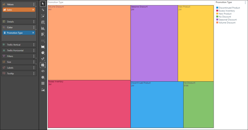 Using the Sample Demo model, add the Promotion Type hierarchy to the Color drop zone;