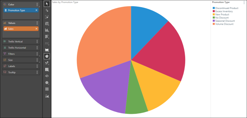 Segment charts provide good ways to visualize a few elements as a proportion of a total. Segment charts require a member hierarchy in the Color drop zone and a measure in the Values zone. The member hierarchy drives the segment colors, with each member element being represented by a segment; the value drives the size of the segments.