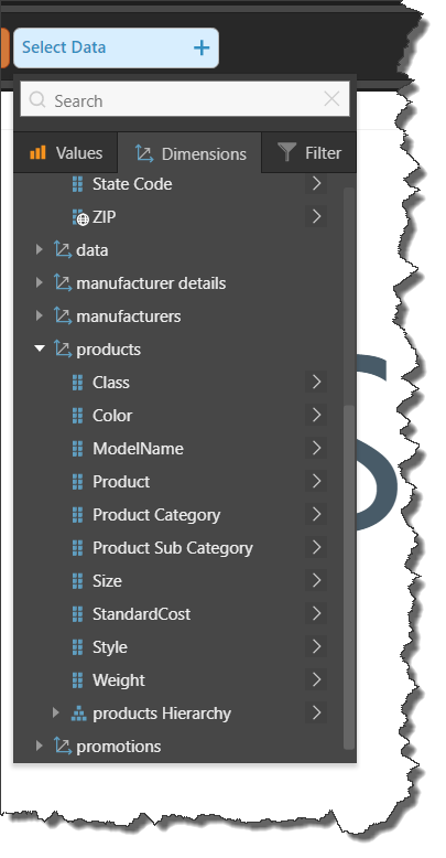 Dimensions represent the tables in the data source, and constitute the quantitative data in the model. The Dimensions tab is accessed via the Data Selections Panel; each dimension can be expanded to expose the hierarchies contained within them. The hierarchies represent the columns within the tables in the data source.