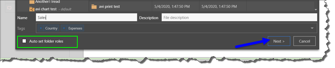 By default, Pyramid automatically sets role access to items saved in the Public Content folder. If you want to set role access to your discovery manually, deselect the 'Auto set folder roles' option (green highlight below), then click Next (blue arrow)