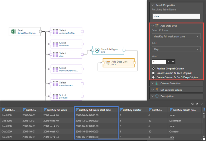 In the example below, the Add Date Unit node was connected to the Time Intelligence node. It was then used to create a new 'full week start date' column, with the start date of each week delayed by 1 day (red highlight below). This column then replaced the original column in the table (blue highlight).