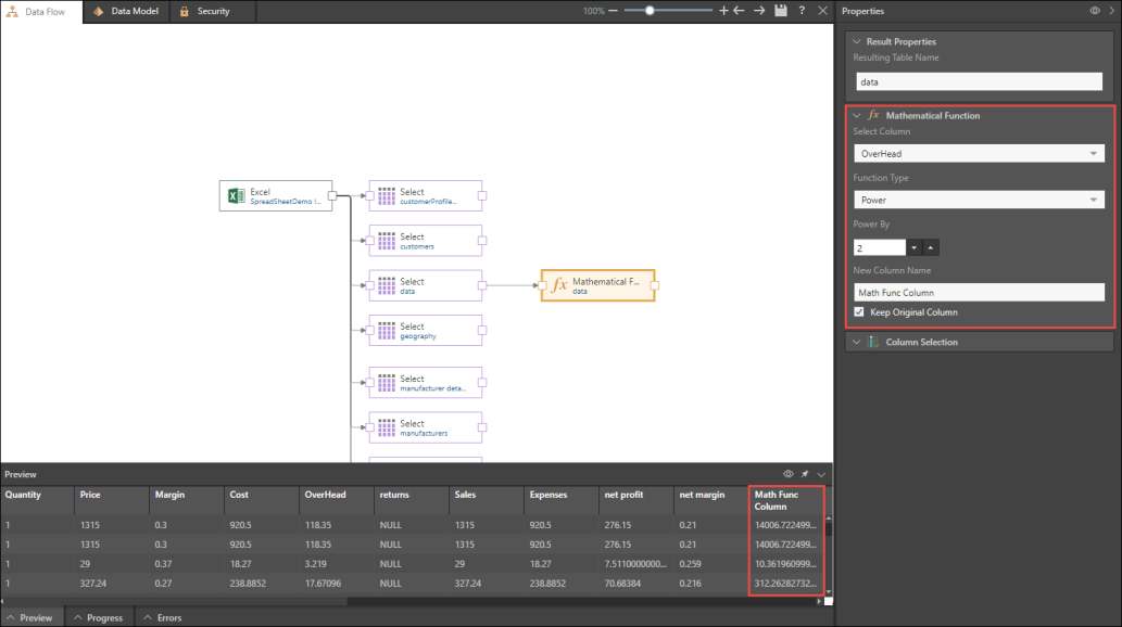 After connecting the Mathematical Function node, specify which column you want to apply the mathematical function to. Next, select the type of mathematical function, and enter a name for the new column. Choose whether or not to keep the original column in the table.