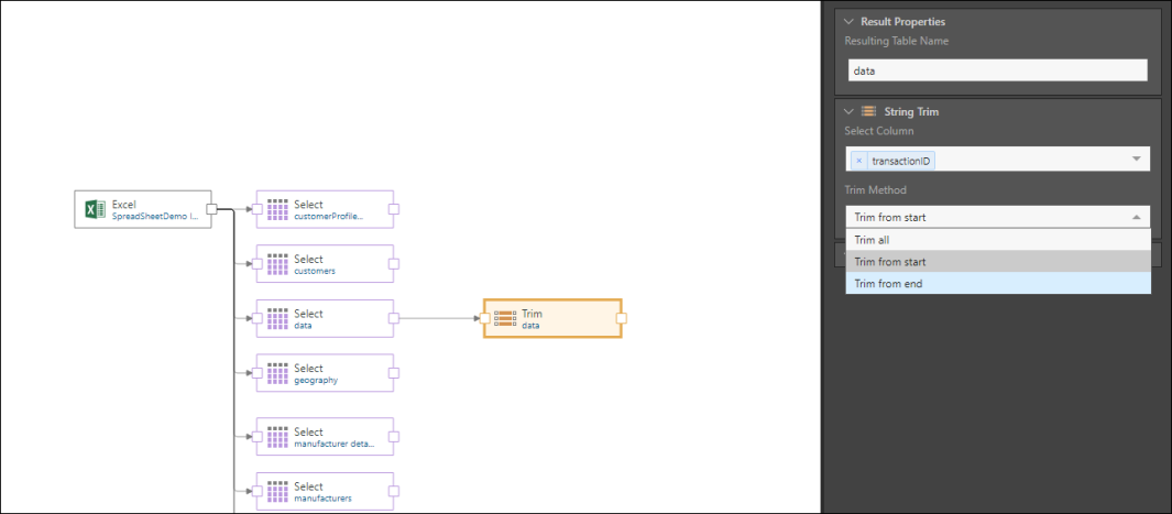 Similar to Left String and Right String, use Substring to select part of a string to include in a column. In the screenshot below, a substring of four characters was selected from the Transaction ID column.