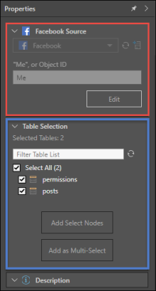 To connect to the Facebook datasource, add the Facebook node to the canvas. With the node selected, choose the required Facebook Source from the Properties panel: select the server, and then in the text box (red highlight) write either: