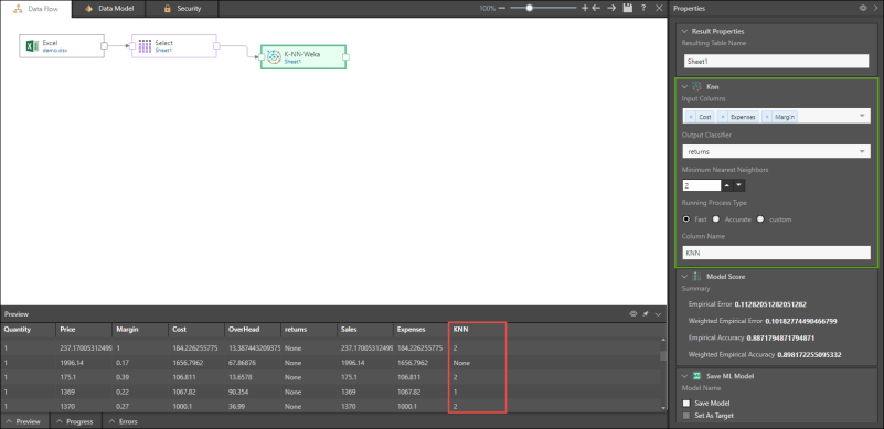 In the example below, the KStar Weka algorithm is used to predict returns by cost and expenses, and the result is saved as a model and set as the target (in red).