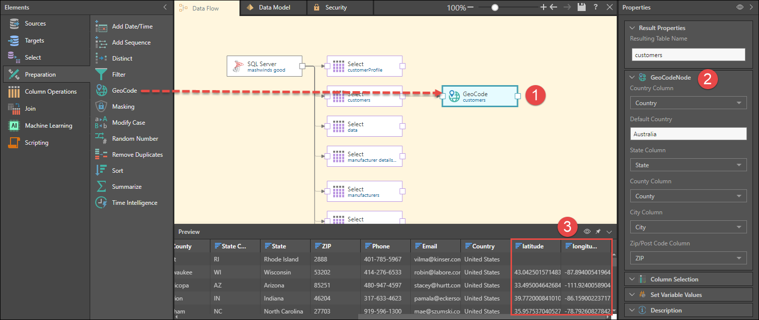 3. Preview the GeoCode node to see a preview of the table with the latitude and longitude columns.
