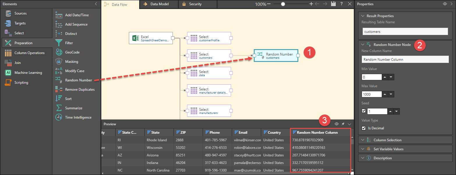 By default, when the preview is refreshed or the ETL is run again, the numbers generated for each row by the Random Number node will be refreshed. This means that each time the ETL is run the number for each row will be changed, and this will be reflected in any existing data discoveries containing the random number column.