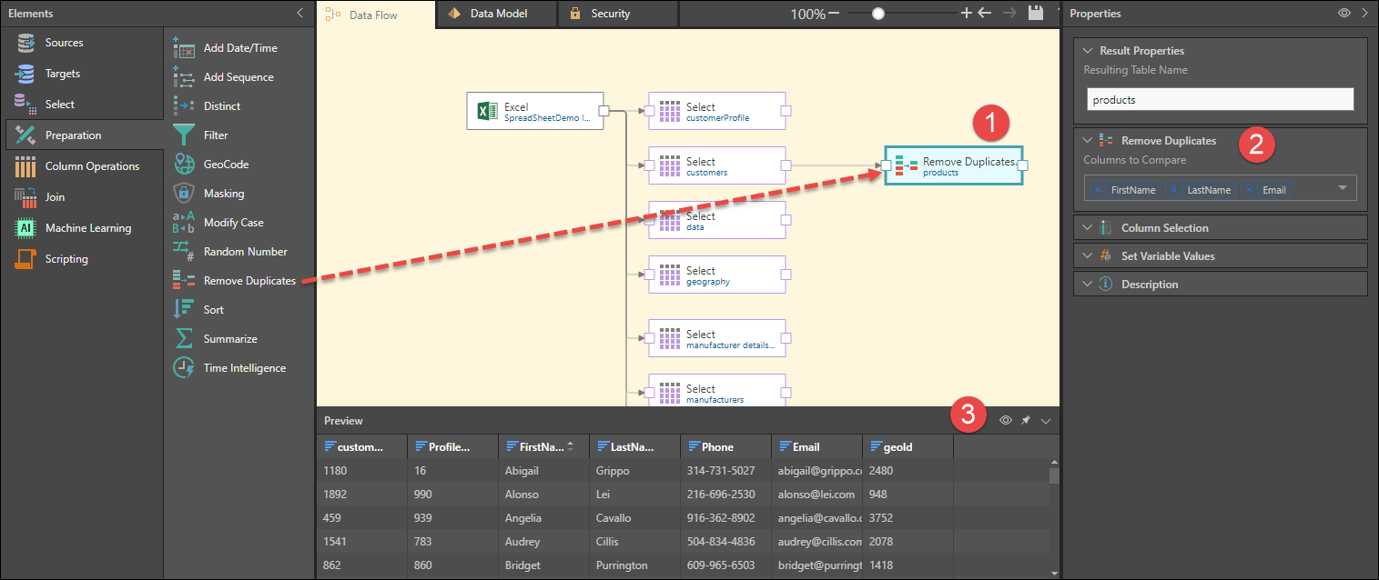 The Remove Duplicates node will retain the first duplicate row and remove the remaining duplicate rows. For example, say the First Name column is selected as a column to compare, and the column contains three customers with the first name Fred, in the following order: Fred Johnson, Fred Jackson, and Fred Jason. The first row containing "Fred" will be retained, and the other two will be removed.