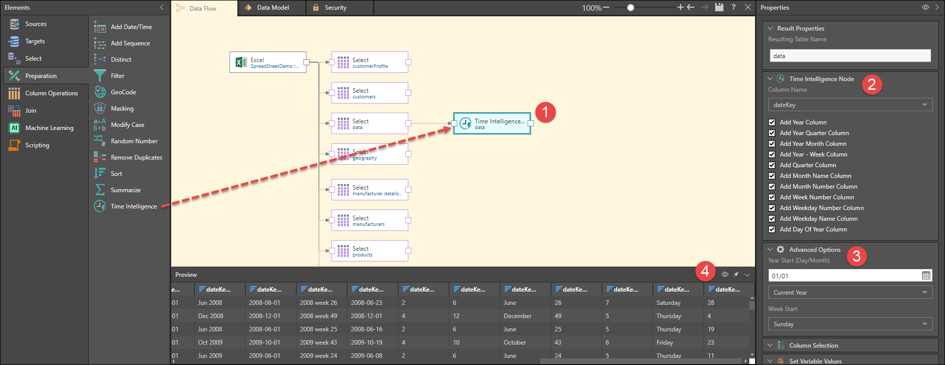 - Connect the Time Intelligence to a table node containing the relevant date or date/ time column.