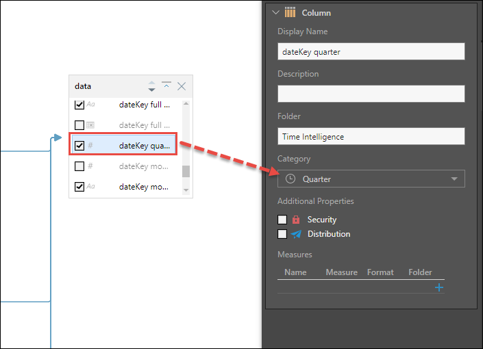 - From the Properties panel, go to the Time Intelligence Node window and select the date/ time column you want to perform time intelligence on, then deselect any columns you don't want to include.