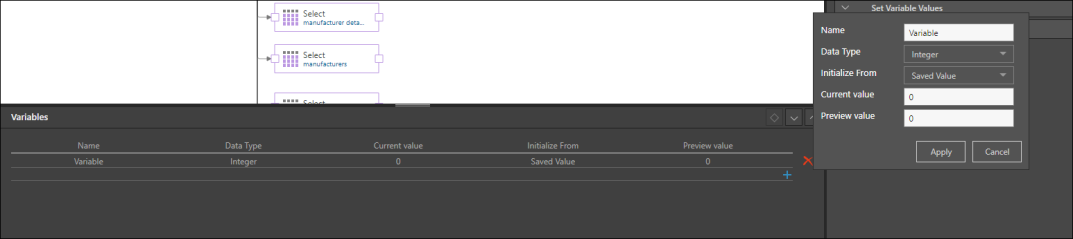 Click the relevant node, and from the Properties panel, open the Set Variable Values window. To add the variable, click the plus sign to open the pop-up window below: